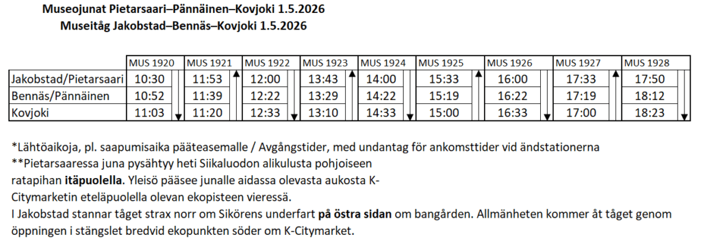 Blåtåget är tillbaka i Jakobstadsnejden! På valborgsdagen 1.5.2026 kör Haapamäen Museoveturiyhdistys ry skytteltrafik med charmigt rälsbusståg av typ Dm7 mellan Jakobstad och Kovjoki med uppehåll i Bennäs. Det går alltså bra att även åka tur-retur i riktningen Kovjoki–Bennäs–Jakobstad.